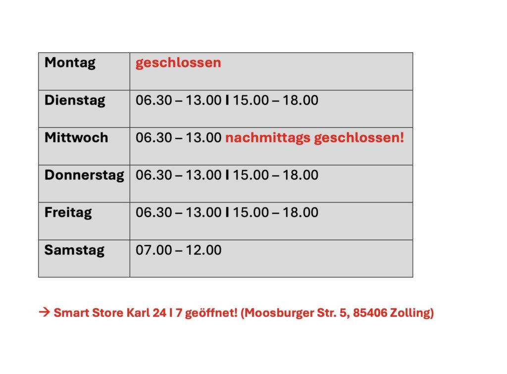 mittwochs von 06.30 – 13.00 Uhr geöffnet, nachmittags geschlossen!